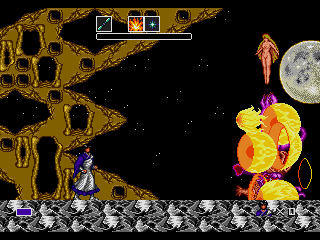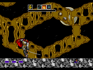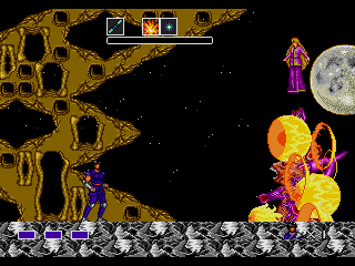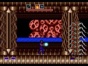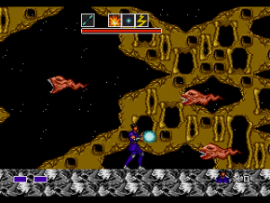 The visuals are also among the best of the Genesis’ first generation of games, with Rieko Kodama once again contributing, along with Phantasy Star alumni Takako Kawaguchi. Looking at the Aliens-inspired bio-mechanical horror of Scene 3, or the multiple layers of light-brown waves and red skies in the next level’s background, it’s hard to believe the game is from 1989. Between each level, there’s a cool animation of the hero charging up an attack and firing it at the screen.