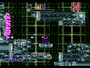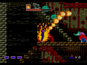 Apart from the somewhat tedious second stage, the level design is quite solid. The levels are short and smartly-constructed, with some more focused on fighting and others on platforming. The jump is a little wild, as it takes you very high in a very short amount of time; in general this means being careful not to hit your head on the ceiling so as not to interrupt the arc of the jump. There are parts specially-designed to force you to make clever use of your weapons, such as platforming sequences where you must execute a series of jumps while letting your flamethrower burn enemies as they fly at you, or a level where you can seek cover behind large skeletal remains and send balls bouncing everywhere to clear up the screen. The boss battles, too, are usually quick and straightforward, though it doesn’t mean they’re all pushovers. In fact, the game has some notable difficulty spikes, particularly Scene 4 and the final boss battle, which requires some slick dodging of projectiles, again evoking a shmup more than a side-scroller.