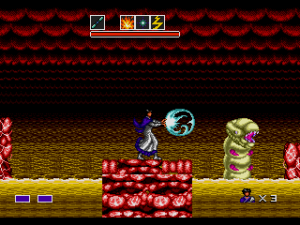 Though not outright gory like a Splatterhouse, the more subtly creepy setting helps give the game a flavor of its own. Early in the game, the player faces the ghosts of the Jesuit missionaries enslaved in death by Nobunaga / Zareth. Once defeated, a surviving monk holding what appears to be a bible revives them as monstrous spiders and they scutter away, only to return several levels later to combine into a giant worm. Neither this red book nor the crucifix later on in the game were altered in the North American release, contrary to common practice at the time.