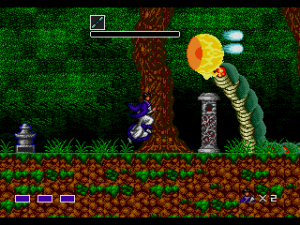 The basic attack is a ball of spiritual energy that can be charged to let out a more powerful blast, like in SpellCaster‘s side-scrolling sections, but this is where the similarities end. For one thing, Joe moves fast, and you can actually walk and fire at the same time, as well as hold a charge while moving. The first level plays like Revenge of Shinobi with a mystical bent, as you jump around from tree-to-tree and dispatch evil monks and snakes with single shots. But once truly underway, the game imposes a unique twist on the side-scroller formula, with a weapon system straight out of a shoot-’em-up. You’ve got three main means of attack, which you may switch between at the press of a button; in addition to the energy balls, there’s a sort of spiritual flamethrower and a spell that sends balls bouncing every which way. While the basic attack is best suited for weak enemies, tougher foes are better handled by charging your attacks. A fully-charged fire attack will shoot a flame in front of you for several seconds, whose angle can then be changed by pressing up and down on the D-pad, while the bouncing balls can reach hard-to-hit foes or allow you to concentrate on avoiding an enemy’s attacks while they do the damage.