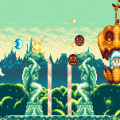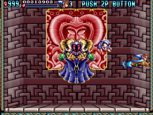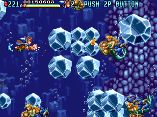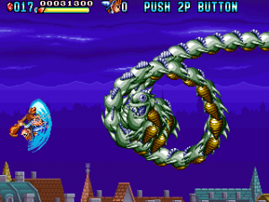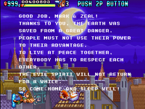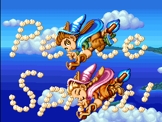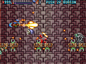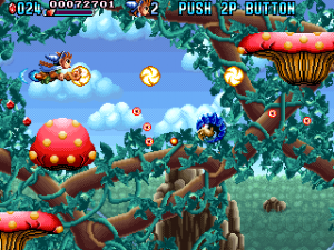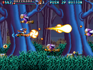 The game offers two player simultaneous play, taking on the roles of two young broom riding witches – Mark, the blue guy, and Zeal, the red girl. By default, you start with the fire magic, which can be charged up a la R-Type. Defeated enemies drop jewels, occasionally in ornate patterns, which will upgrade your weapon (and provide an end-of-level scoring bonus). Grabbing enough will increase your weapon level, which will let you charge your magic even higher for stronger attacks. The fire magic works like an explosive, spreading outwards when it hits a target and inflicting extra damage. You can also switch to lightning magic by grabbing power-ups, which is less powerful but more versatile, as it shoots upwards and downwards, and travels along the scenery.