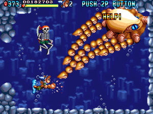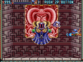 The fantasy-influenced visual style also differs from the usual Irem shooter. That being said, despite starring broom-riding witches, it’s not really a “cute-em-up” in the same that, say, Magical Chase or TwinBee are. There are certainly more lighthearted aspects, like the evil black cats in the first stage, or the fireworks in the background that explode in the image of the main characters. But then there are enemies like a grim reaper, whose decapitated head begins attacking you, leaving a visible stump on its body. Later enemies include gigantic skeletons and some other relatively gruesome designs that subvert some of the usual light-hearted fantasy tropes. It’s here where Irem’s always talented pixel artists fulfill their consistently high level of quality, especially with the army of flying dragon-turtles in the third stage, which replace the usual armada of battleships seen in other shooters. In this way, Mystic Riders is most closely comparable to Success’ Cotton, which was released a year prior in 1991. It also has a slightly darker than usual theme for a cute-em-up (something its sequels toned down a bit), both inspired by Halloween, but when pitted against each other Mystic Riders is a much more unique, well developed game.