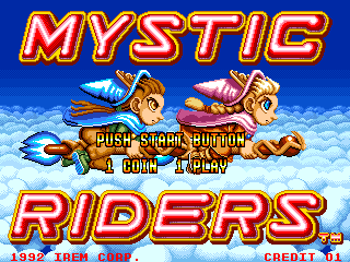 Irem was typically known for dark shoot-em-ups, ranging from the biomechanical Giger-esque designs of R-Type and X-Multiply, the dark fantasy of Dragon Breed, or the military sci-fi setting of Air Duel. Mystic Riders is a departure from all of this, focusing on two broom riding magicians, set in a fantasy world. It was not developed by Irem’s regular shoot-em-up team, but rather by some of the folks who had previously worked on Daiku no Gen-san (AKA Hammerin’ Harry), which was also more comical in tone. The Japanese title, Mahou Keibitai Gun Houki, means “Magic Defense Force Gun Broom”.