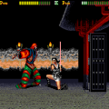 In either version, the stages are decently paced but mostly uneventful. The exceptions are Stage 5, set on a bridge surrounded by hellish flames that flicker red and blue and from which you can throw off nearly every opponent, and Stage 6, the true final stage, a sort of boss run set in a what appears to be a floating Japanese castle’s inner room.