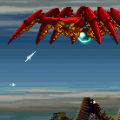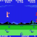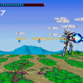 Dozens of these later and you descend down a brown slope and land near a settlement to then begin Scene 2. Some ways later into this an enormous white attack ship ascends from the ground to attack – acting as a sort of boss. After a few hits it catches fire and goes down, cue the descent slope. Scene 3 is pretty cool, since it culminates with the Flying Jar from the movie, carrying the baby Ohmu. At this point the fire button causes Nausicaä to fly from her Gunship, aboard her glider Mehve, and travel outwards as long as it’s pressed. Let go and she starts to return. Pressing up and down moves both Mehve and her Gunship. The task is to send her towards the baby Ohmu to cut the ropes, while simultaneously avoiding the Gunship or Mehve hitting the oncoming Jars. Do so and the baby falls to earth safely. Unfortunately it’s not obvious what’s supposed to happen next, since the game seems to get stuck. Even after rescuing the Ohmu and returning to the Gunship you still can’t shoot, nor can you in any way damage the oncoming Jars or the one which carried the Ohmu. Pressing fire just sends Nausicaä out again. Is it possible to go beyond Scene 3? It’s not clear.