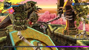 The graphic design also relies heavily on the theme of “gears”. Nayuta’s sword attacks are Gear Arts; Noi floats with spinning gears; many of the stages have large, rotating gears throughout. One of the best weapons you can find is a gigantic sword that has a blade like a chainsaw, except it’s comprised of mini gears. This is representative of technology of the lands explored by Nayuta, in contrast to the world he knows, which isn’t quite as advanced.