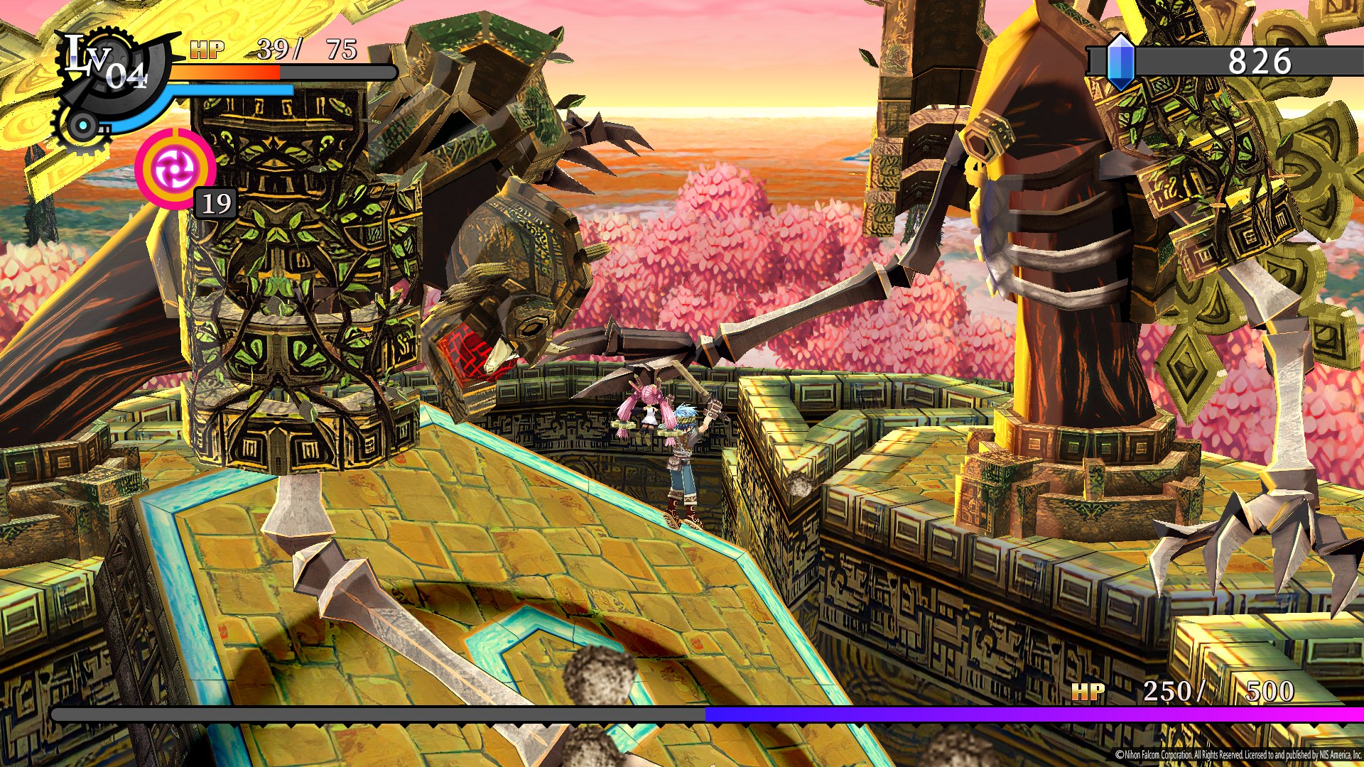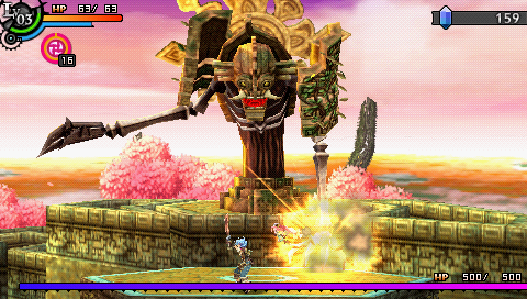 For example, when you first enter La Worg, it’s a canyon floating with lava, but when playing through in winter, it’s all changed to freezing ice. The third time, it’s spring, and the areas that were previously liquid are now sand. In one of the levels, there’s a whirlpool that you needed to jump around in the winter and summer variations, but in the fall version, you need to get sucked in, which takes you underground to a whole different, previously unexplored part of the stage. It’s a substantially more refreshing way to add content while still recycling level layouts, and works much better than the reversed levels found in Gurumin. There’s also quite a bit of content. In the main game, you go through two variations of each of the four areas of Terra, plus several other levels afterward leading to a major battle. There’s a substantial epilogue chapter which features a third seasonal variation, with the fourth unlocked in New Game+.