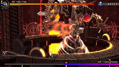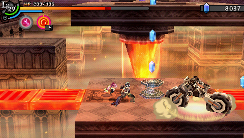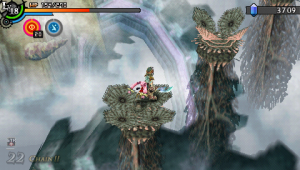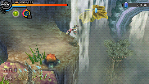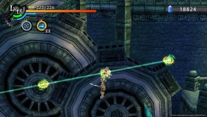 Separate from the magic spells is the Gear craft gauge, which manages a number of different abilities, and also regenerates automatically. Nayuta can execute a chain of special attacks by holding down the attack button. A few levels in, Nayuta obtains the Gear Hold, which lets you hang onto grapple points, which makes platforming a little more interesting. Even cooler is the Gear Buster, which encases you in a gear and lets you roll around. It’s a bit like the Spider Ball in the Metroid games, in that you can use it to climb up certain tracks, but it’s also a fantastic offensive weapon, because you can bound into an enemy arena and whirl around to get some quick hits in. Plus, it’s a much faster method of transportation – why walk when you can roll? It’s a shame that you don’t get it until halfway through the game, because that’s the point when The Legend of Nayuta is elevated to a whole new level of excellence.