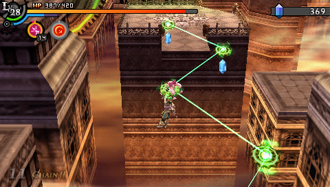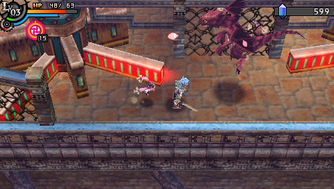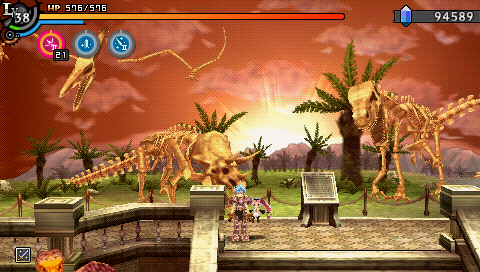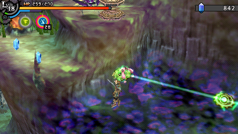 The controls are similar to the Ys games, although Nayuta’s actions are a little weightier and slower. However, unlike the later Ys games, which removed the jump button in favor of a dash button, The Legend of Nayuta uses both, which allows for both maneuverability in combat and platforming elements in the stages. In the beginning, Nayuta’s moves are rather basic, and the first levels are a little on the dull side. As the game progresses, you find new types of weapons with slightly different rhythms, plus gain new abilities like guards and downward stabs. In the Zwei!! games, you needed to switch between your two characters if you wanted to use physical or magical attacks. Instead, while you control Nayuta, Noi simply floats by your side, and her magic is activated with a seperate button, allowing you to use both types of attacks at once. Each magic spell has a limited number of uses, but slowly regenerates over time. Repeated use also levels them up, to increase their strength and grant more uses.
