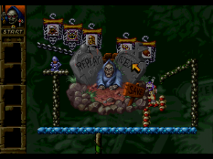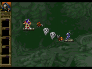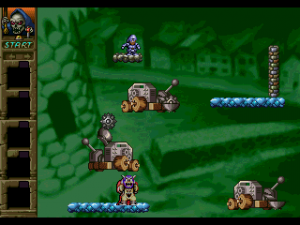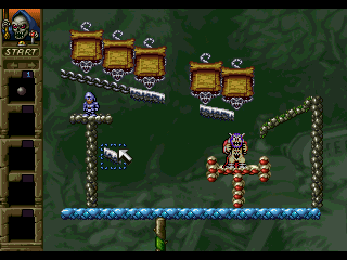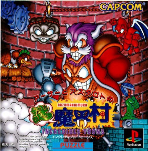 For whatever reasons, Capcom licensed this engine, plunked Ghosts ‘n Goblins characters into it, and the result was Arthur and Astaroth’s Nazo Makaimura: Incredible Toons (“Puzzle Demon World Village”). It stars cute, chibi versions of the cast, including Arthur, Astaroth, Red Arremer, the Grim Reaper, the first level boss from Ghouls ‘n Ghosts, and others. It has many items from the game too – for example, in order to get Arthur to move, you need to lure him with an armor power-up. All of this features a variety of remixes of the standard theme song, along with an intro almost exactly like the arcade games.