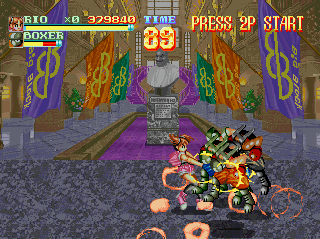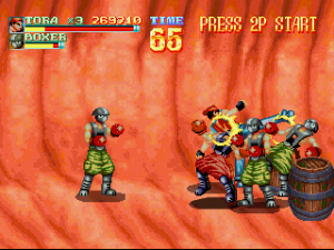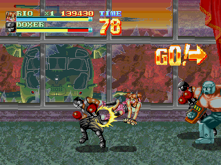 Where things get interesting is in the surprising amount of moves each character has. Standard combos, moves that require fighting game-styled inputs to pull off, two grab attacks, a pair of aerial attacks depending on what direction you press, a dash attack, and a special screen-clearing attack that reduces your health: it offers up a wealth of options for taking on enemies, and each character has their own unique movesets. While Rando’s the slowest character, he can pull off some deadly suplexes and powerslams among other crowd-clearing moves. Rio is perhaps the weakest of the three, but quite versatile with her special hammer. Tora sits in the middle, with a comparatively limited moveset that can still deal some damage.
