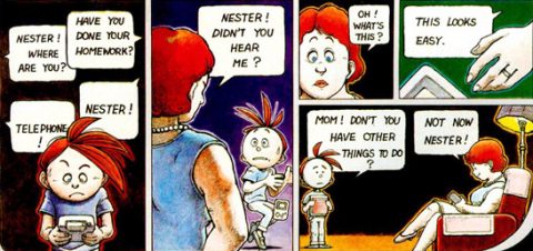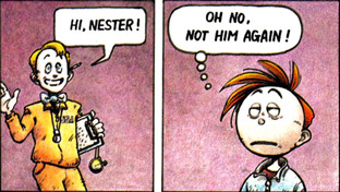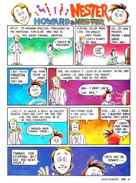 Nester was created as the teenage comedic foil to Nintendo Power‘s original editor and all-around spokesman for the company at the time Howard Phillips, both the main characters in the included one-to-two-paged comic for the magazine. In “Howard & Nester” the red-headed smart aleck generally acted as a snidely wise-cracking know-it-all playing or starring in the latest hottest new Nintendo game – usually one that received a lot of coverage from the previous issue – while ignoring the tips given to him by the bowtie-wearing straight man Howard. Nester’s popularity grew fast enough that he served as the mascot of the magazine and would appear within various sections of multiple issues. Even the fan-picked annual Nintendo Power Awards gave the winners “Nesters” for categories like Best Character or Best Play Control during the early span of the publication. After Howard left Nintendo to work at JVC, the comic continued under the new name “Nester’s Adventures” with the teen riding solo in his daily life or inserted into another popular new release. The art shifted over the years ever since the beginning, changing artists many times and possibly writers as well, quickly losing steam and life in the work shortly after Howard’s departure. By 1992 the magazine had began printing newer longer formed comics based around Mario, Zelda, Star Fox, and others which were better drawn and written than the later Nester’s exploits. Nintendo Power quietly ended his run at the end of 1993 with only spotty cameos later on.