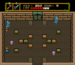 Your sword is permanently assigned to the I button, while you can equip any item to the II button through the pause menu. Items can be found in treasure chests, bought in shops with gold you find on your journey, given to you by NPCs, and picked up from defeated enemies. The vast majority of items are identical to those found in Zelda, usually with a different look or name, but a couple of them are original. These include the Magic Ring, which transforms enemies into much weaker ones, and the Wings of Return, which bring you back to where you last saved.
