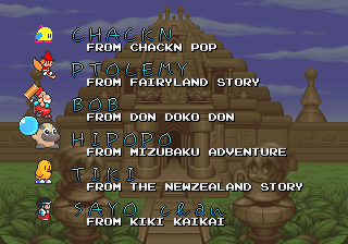 Finally, in 1997, almost 10 years after the original arcade game, Tiki can be controlled again by players, even if only indirectly, in the context of a puzzle game. Pop ‘n Pop is a title that can be described as “Puzzle Bobble meets Space Invaders” where you have to match and pop colored balloons, starring cute characters from past Taito titles like human Bub and Bob, the dwarves from Don Doko Don, Sayo-chan from Kiki Kaikai and Tiki with Phee-Phee, whose stage in Puzzle mode is once again Auckland Zoo. Tiki’s special weapon is of course based on his arrows, and when he makes some combos he is surrounded by his fellow kiwis.
