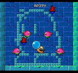 Taito had the habit of putting references to its past games in other titles, at least since Bubble Bobble, and Tiki is no exception. The first cameo is probably the one in Liquid Kids / Mizubaku Daibouken (1990, here seen in the PC Engine version) where a secret area has blocks forming the shape of the little bird, much like some warp rooms in TNZS itself had outlines of Ptolemy from The Fairyland Story and of a Puka Puka ghost from Kiki Kaikai.