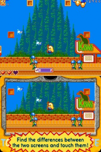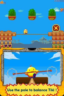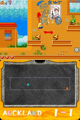 There are also some minigames that require the use of the stylus. They are very simple stuff, like spotting the difference between two pictures, catching fish, helping Tiki cross a tightrope or opening the doors by rotating their handles. The problem is, they not only appear abruptly, but in some cases the action on the upper screen is notstopped, meaning that you have to pay attention to the minigame but also to the platforming section. This is already difficult on its own because, like in the arcade original, enemies come in swarms and rapidly home on Tiki. So the whole stylus gimmick comes off as unnecessary and tacked-on. Luckily not all the minigames are actually needed to progress in the game, some are just for getting bonuses and finding secret areas.