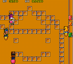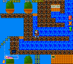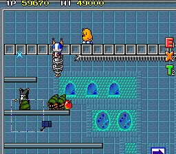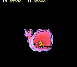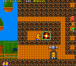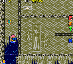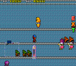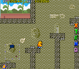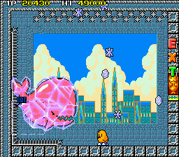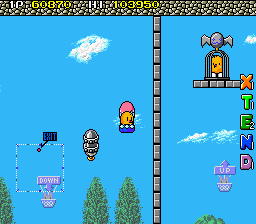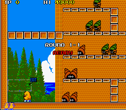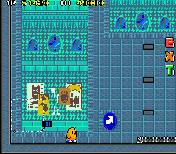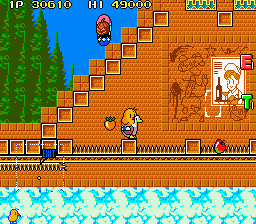 Another interesting feature are the warps, portals that let you skip zones, which appear by shooting in empty corners of the levels. As is the case with every arcade game in the 80s that featured secrets (many of them were crammed in Taito platformers of the time), this keeps players looking in every nook and cranny to find them. The original Japanese arcade version has a warp in stage 1-4 that takes Tiki to stage 2-1 and another one in that level that brings him back to 1-4, thus allowing skilled players to go on to play indefinitely and rack up huge amounts of points and extra lives. A later version put a stop to this by putting some blocks between Tiki and the warp, and then modifying the layout of the levels.