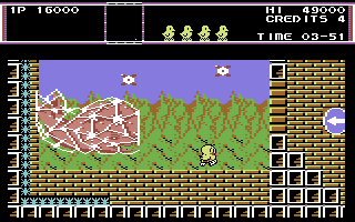 The C64 conversion was handled by Imagine Software and is a decent port, especially in the music department (primarily the thumping boss theme), even if you have to choose either music or sound FX. The graphics are quite pleasant, with a small status bar on the top of the screen that even includes the map. Tiki is fine, even if he looks even more like a chick, and he is drawn in a higher definition than the enemy sprites, which are barely recognizable, ugly pixelated blobs (the crabs seem moving turds, for one). The collision detection is also not up to par.