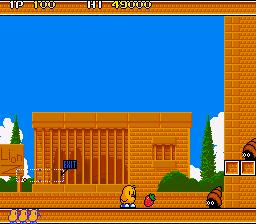 The PC Engine port is accurate enough, and the graphics are full screen, but on the other hand the intro is text-only, the color palette is ugly and garish, with strange color choices, the music is more high-pitched, and the piercing sound effects drown it. Also, the in-game mechanics of handling bonuses (depending on the fruit items you picked) is different from the arcade. The Master System port, only released in PAL territories, looks decent, though the sound is a bit annoying. It’s the only one where the freed kiwis float vertically above instead of jumping in place.
