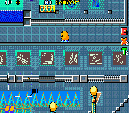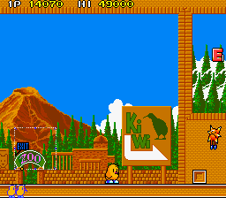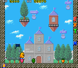 It’s not known why the development team chose a real life location to set the game in (it seems that one Taito employee went on holiday there and wanted to make a game about the places he’d seen), because outside of the New Zealand map that appears between the stages and the names of the zones such as Auckland, Rotorua, Mount Cook etc., the environments have very little to share with their counterparts. For one, there actually aren’t so many spikes around. Our hero Tiki is supposedly based on New Zealand’s animal mascot, the kiwi bird, but looks nothing like it, instead resembling an animesque chick with sneakers on his feet. Some posters in the background have a realistic kiwi silhouette on them, and the difference is noticeable. You can let him flap his wings and hover a little if you press rapidly the jump button while falling, whereas in real life kiwis are flightless birds.