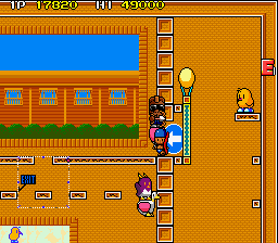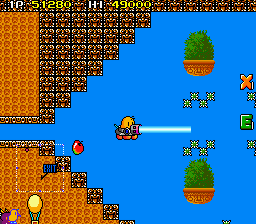 There are different types of vehicles, including zeppelins and hot air balloons, each one with different weight, speed and maneuverability. They go from the cumbersome “metal balloon” – too slow, heavy and big to successfully navigate the maze – to the awesome UFO – very fast, unaffected by gravity and inertia, almost indestructible and with a devastating laser beam that also goes through walls! To steal a vehicle, Tiki simply has to jump onto it, which shoves out the enemy piloting it. (Grand Theft Auto has nothing on him.) Among the many bonuses the game offers include the EXTEND letters from Bubble Bobble that give an extra life, and a joystick that removes inertia and gravity from the vehicles (i.e. you don’t have to press the jump button to move them), making them all control like the UFO. Be careful though – the vehicles are still vulnerable to enemy fire and other hazards, and Tiki can still be killed if the attack hits him directly.