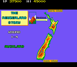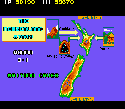 There are actually four different ROM sets (with five designations in MAME) with various differences. These include the original Japanese arcade release (Japan, Old), the original worldwide release (World, New), the revised versions, which include an add-on arcade board with an additional Z80 processor (World and Japan, New), and a prototype version used for location tests (Japan, prototype). All of them are called New Zealand Story, with no specific indicators other than different looking title screens. The changes include different level orders, altered level layouts, and changed warp positions. The “New” versions also have improved graphics in areas. Most of the home ports are based on the original Japanese arcade game. The original World release is much more difficult than the other versions, with more spikes and enemies.