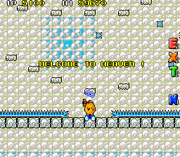 Maybe “immortal” is not the right word though, because Heaven is playable and plays like any other level, despite being made of fluffy clouds. There are loads of spikes and enemies (who, like Tiki, will all have a halo on their heads) and the goal is to reach the exit, which features not a cage, but a Virgin Mary-look-a-like called “The Goddess”. After having reached her, the player is given a short message and then the game will end. The message, however, ends with the sentence – “But the Heavens had got an exit to the underworld”. Indeed every Heaven (the Heaven level changes depending on the stage where you died) has a well-hidden escape route, and Tiki will be given another chance by restarting in the level after the one he died in, but a single time.