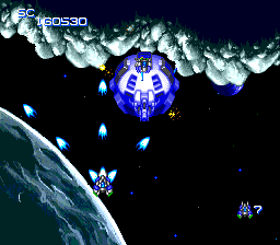 The first level does the best job of showing off Nexzr‘s strengths. It takes place in the middle of a massive galactic battle, as you see ships far off in the distance exchanging laser fire. You fight a few gigantic battleships, which is par for the course, but then a new one warps right into the middle of the screen with fancy raster effects, commonly seen in Genesis titles but relatively rare in PC Engine games. There are subtle details, like the fluidly animated explosions, or the animation of your homing fire weapon. Your ship enters and exits each stage by zooming into and out of the screen, mimicking scaling effects typically only seen in SNES games.