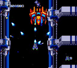 The weaponry is rather restrained. There are two weapons attached to your ship – a standard weapon and a subweapon – both fired with a single button. There are no bombs or anything else of the sort. The standard weapons are the usual rapid fire forward shots and three-way beams, while the secondary weapons include homing fire weapons and automated satellites, which patrol around the screen and doggedly attack anything that comes close. There are also shields, though they only absorb a single hit. Some of the secondary weapons are underutilized, rarely showing up, though some are clearly much more powerful than others.