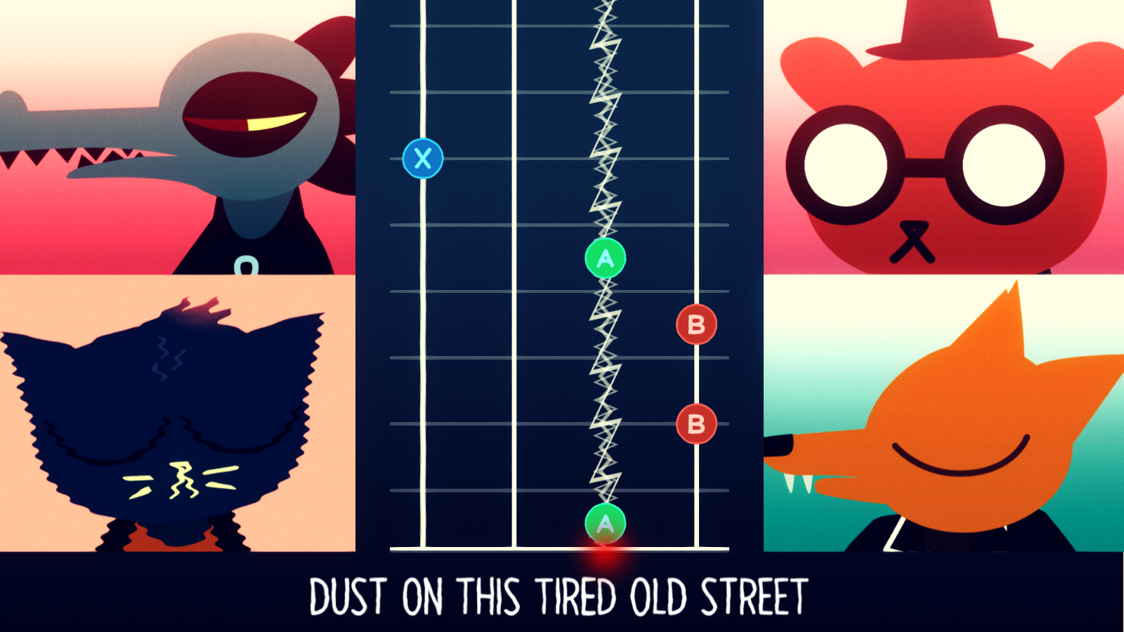 Despite the intriguing story, and its relatively short length, Night in the Woods only casually wanders through its plot developments. There’s certainly weird stuff going on, but Mae isn’t really compelled to be a part of it, at least at first. Instead, the first half of the game is just spent hanging out with her old friends, who are still in town. Her best buddy Gregg is a fox, who works at the local convenience story but will abandon his post at a drop of a hat (seemingly without consequence) to hang out with Mae. Angus is his mildly geeky boyfriend, a large bear who works at a video store (which is somehow still in business). And Bea is an alligator who has taken over her family’s hardware store business after her mother passed away, whose grade school friendship with Mae has since dissolved. The town itself is just as much of a character too, as Possum Springs is an old mining town whose industry has since been closed, resulting in all of the old employees being stuck in retail jobs, and their children leaving for greener pastures, leaving nothing but economic turmoil.