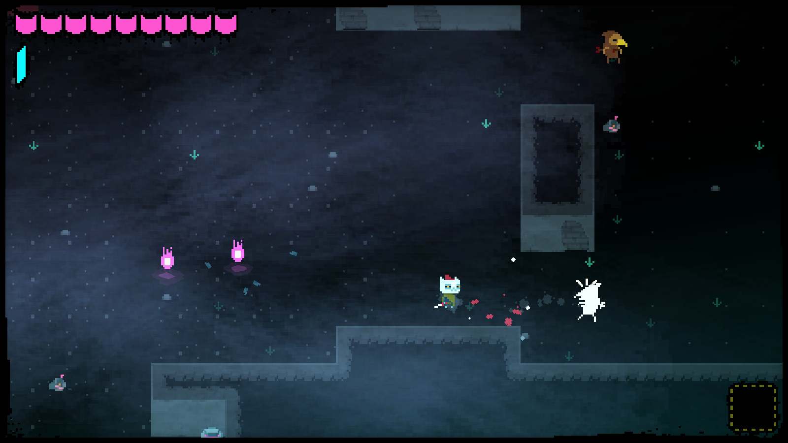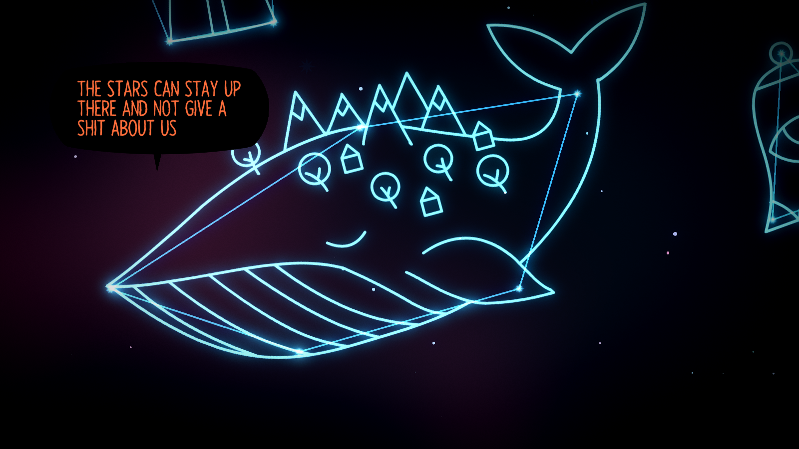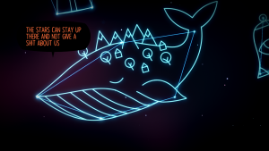 Preceding Night in the Woods’ release in 2017, there were two other free supplemental games that introduce the game’s characters. In Longest Night, you join the cast stargazing late at night around a campfire, tracing lines between the stars. When you reveal a form, you’ll trigger a story about the (fictional) constellation. A similar segment is in the main game where you look through Mr. Chazokov’s telescope to look for “dusk stars”. Lost Constellation takes the form of a story told by Mae’s grandfather, about a astronomer named Adina Astra, who travels through a haunted forest to the Frozen Lake in order to visit the ghost of her deceased lover. Neither are essential to the main story, but they add some nice background, especially in the brief glimpse of Mae and her grandfather, who had passed away by the start of the main game.