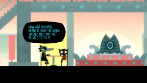 The game is set up like a side-scrolling platformer, as Mae wanders around towns and talks to people. However, there’s barely anything in the way of puzzles or challenges, and even when there are, they feel weirdly out of place. It’s heavily dialogue based, though it doesn’t really use dialogue trees like most adventure games – you just choose between responses (typically one of two) and then the conversation goes on. In many ways, it’s sort of like a visual novel, just with more direct control and interactivity. It might seem like that doesn’t mean much on the surface, but it really gives the town more character, as you can jump on people’s cars, teeter on the electric lines, and otherwise interact with the environment in ways that are more satisfying than just point and clicking.