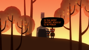 There’s no voice acting, but for the kind of writing style, it’s better this way – a lot of it would sound weird when spoken. The only downside to this is with the band practice songs – they have lyrics, shown at the bottom of the screen, but without vocals, they feel a little empty, even if the main melodies are awesome. The fan community quickly took it upon themselves to make covers of the three tracks – “Die Anywhere Else”, “Weird Autumn” and “Pumpkin Head Guy” – with their own vocals added in, which makes up for this shortcoming.