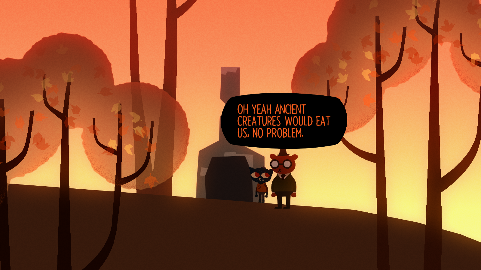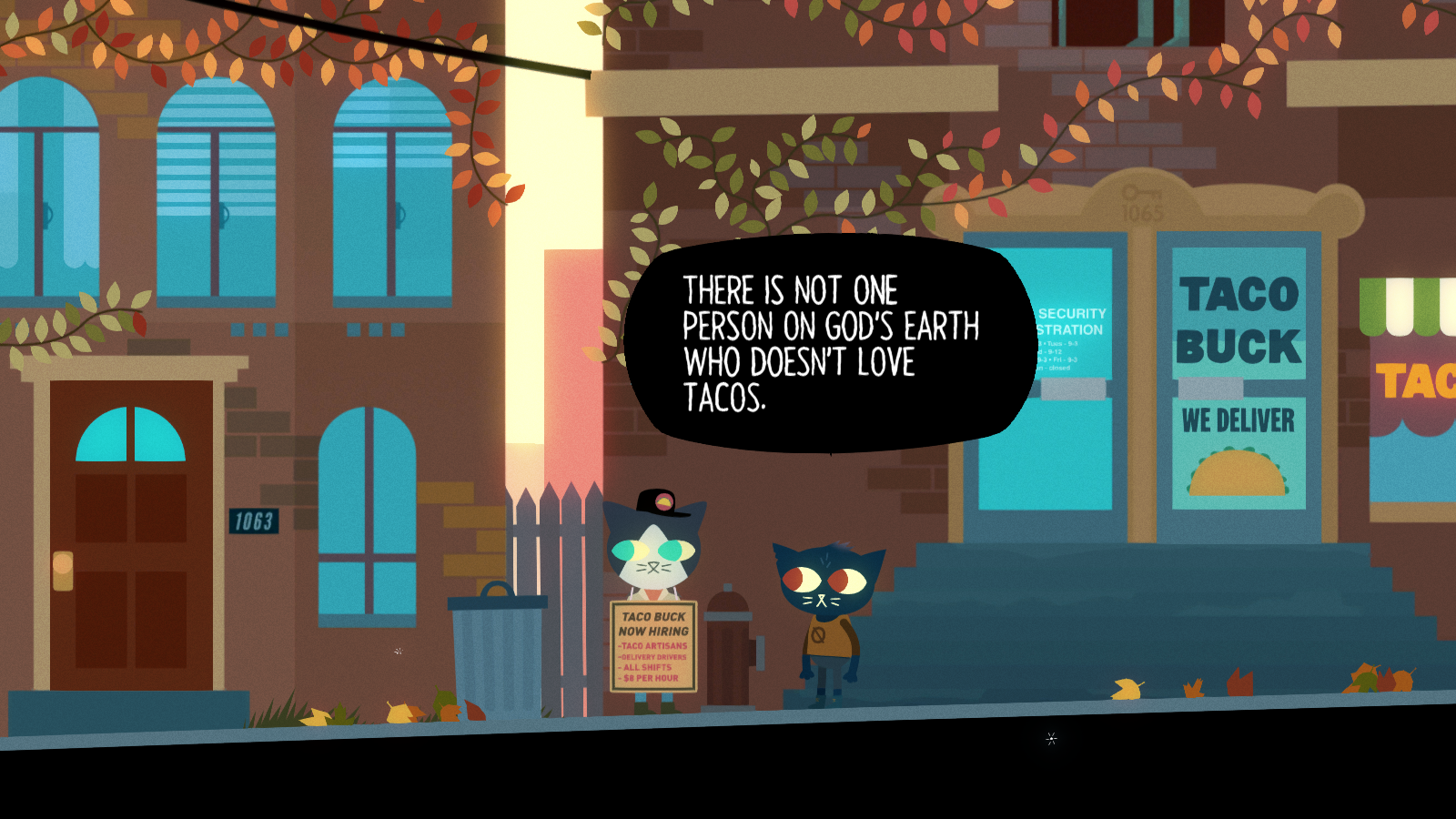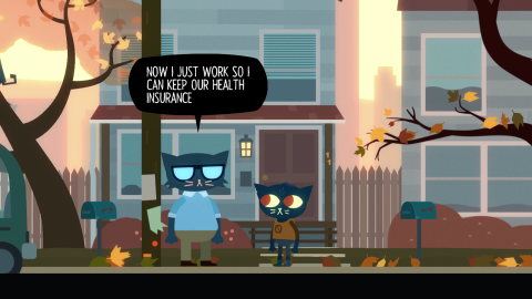 Just as important to the storytelling is its visuals and sound. The art style uses lots of round shapes and simple colors, looking a bit like an animated storybook but it’s charming, and there are lots of little details in the animations that make the characters feel more alive. Mae’s gigantic eyes make her immediately endearing in spite of her some more troublesome personality issues, and even slight changes to her expression have an immediate effect. Gregg’s exuberantly waving arms contrasts to Angus’ simplistic, arms-by-his-side walking animation, and Bea has a perpetually lit cigarette in her mouth. The game has a nice autumn atmosphere too, one that presents that town as beautiful on the surface, with its economic turmoil only visible with the number of vacant storefronts.