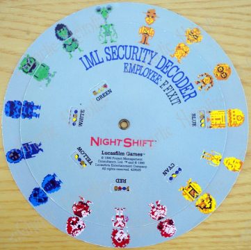 Night Shift came out during the golden age of “feelies” and copy protection, so the box in some versions included a manual apparently written by Mr. Bingham himself and a small newsletter about IML and its founder, but every one of them had a code wheel that uses the same graphics of the game, where you have to align the various action figures’ heads and bodies to reveal the codes required to boot the game. It is amusing, also because you can come up with your own mutant freaks, such as Zak McKracken with Darth Vader’s helmet or Indiana Jones in ET’s body. And, is that hooded creature a Jawa or Bobbin Threadbare?