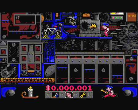 Just like its setting, Night Shift’s art and music are workmanlike. Outside of the “industrial” title tune, there is no BGM at all, only a few sound effects, the warning sirens and BEAST’s constant rumbling that becomes grating after a while. The pixel art is quite nice and animations are smooth, but every level is set inside BEAST so they all look the same, the only difference being the panels covering the unused parts of the machine, and the sole variations are Frank Foreman’s office at the beginning and end of every shift plus the intermission scenes with Fred or Fiona going back home every few nights. The controls are okay and the general concept is interesting, but for a game like this maybe it would’ve been better to implement a cursor like in Lemmings or The Incredible Machine to interact with the items and scenery, instead of relying on a platform game avatar that makes everything cumbersome.