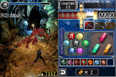 This is the premise to the first modern Ninja Gaiden handheld game, but this time, the pen… er… stylus is mightier than the sword. All of Ryu’s attacks are now executed through the touch screen, and the only button you’ll have to press throughout the game is the block button. What might sound odd works astonishingly well, and in no time you’ll find yourself easily pulling off complicated maneuvers like the Izuna Drop. You walk by holding, attack by stroking through the enemies, and even can use your throwing stars or the bow by tapping on the screen. Jumps are realized through upwards strokes. Also, Ninpo is executed by drawing a symbol, and you can direct it’s power afterwards. You hold the DS vertically like you’re scribbling into a notebook, and thankfully there’s also an option to flip the screens for left-handed use. Ninja Gaiden Dragon Sword is easily one of the few games, alongside titles like The Legend of Zelda: Phantom Hourglass, Trauma Center and Elite Beat Agents, that make thorough and well thought out use of the DS’ capabilities. The only move that doesn’t work quite as well is the Ultimate Technique. You’re supposed to rub the screen to charge it up, but if you don’t to it just right, you’ll execute several other commands before and waste precious reaction time. There’s also a function for the microphone, but that is a very secondary one and feels kinda tacked on.