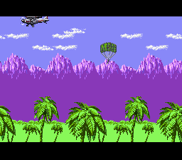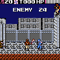 The animation is nothing special even for the NES, but what makes the visuals stand out (besides the awesome cutscenes) are the beautiful stages. They’re displayed in a slight angle, which gives a nice feeling of depth to the visuals. You’ll visit a lof of different locations, like a rainforest, mountains or the downtown of a city. Only towards the end it gets a bit monotonous with the last two acts mainly consisting of temple ruins.