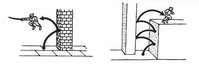 But all the weapons and special items aside, Ninja Gaiden‘s greatest speciality is once again Ryu’s agility as a ninja. By jumping against a wall, he will cling on to it – unless there’s a ladder, you can’t climb directly up or downwards. Instead you have to jump off, and, if there’s another wall facing the first one, climb up by wall-jumping alternately. This wall bouncing technique has since become a staple of awesome action games everywhere.