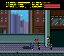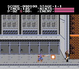 When Ninja Ryūkenden was first previewed in the Japanese gaming magazine “Famimaga” during 1988, the screenshots showed different early prototypes for the game. The level layout seems to have differed vastly between versions (one screenshot shows a fight against boss from stage 3 in the bar at the beginning). In some versions, Ryu’s suit was even colored red, like the player 2 character in the arcade game. The font and the icons for special weapons had undergone some transitions as well (thanks go to Chris Covell for this discovery).