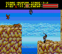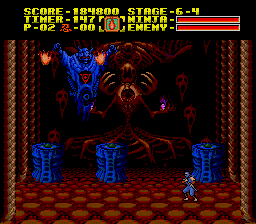 Together with the other two NES games, Ninja Gaiden was altered once again for the Ninja Gaiden Trilogy on the SNES, but this time the changes are much more subtle. The graphical enhancements are limited to a wider color palette, which made the cut scenes look great, but the graphics during gameplay, especially the 2-frame animations, don’t stand up to any other SNES game and are simply disappointing from a technological standpoint. Besides that, there is also some subtle censorship – some depictions of a Star of David that were probably intended to be pentagrams in the first place have been edited out. (This is missing in the PCE port too, but not due to censorship but because of the overall graphical changes – that version also had a much larger and more recognizable pentagram added at another position.) Also deleted from all three games are the end credits, which led to the loss of the corresponding music tracks, too. The music itself is arguably superior to the NES version and uses the extended tracks from the OST CDs, but purists may prefer the simpler original mixes. The timing of the controls doesn’t seem to exactly match the NES version, but again, it’s much closer than the PC Engine port was. The best change is the inclusion of a password system, so you don’t have to start from the beginning every time you turn on the console.