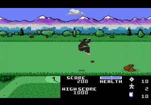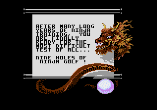 You take the role of an unnamed ninja, who has spent many long years in training in the hopes of becoming a master ninja. As the manual explains, your master is somewhat crazy, and has thus decided that your final test is to survive nine holes of golf. Not even miniature golf, either, which is sort of a shame, given how much mini golf décor would make for a great boss fight. Your task is complicated, however, by the hordes of rival ninja who want you dead, along with the local wildlife.