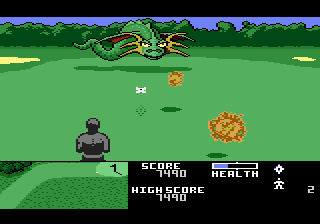 Your goal for each hole is to just reach the green, as the game doesn’t even give you the option of trying to get the ball into the hole. Each hole is guarded by a boss dragon, however, who will float back and forth, shooting fireballs at you while you try to throw shuriken at it. Pretty much every boss fight is functionally identical, however, except that each boss moves a little faster than the last. If you can do this whole routine nine times without running out of lives, you win the game. Once you’ve gotten past the initial concept, you’ve seen pretty much everything the game has to offer in the first few stages.