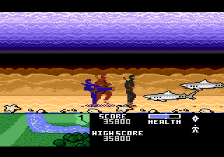 Most of the enemies you fight are ninjas wearing different colors, although they all generally fight the same. Some are a little faster, while others are nearly invisible, but they all just run up to you and try to kick you. Besides the ninjas, every type of terrain has a different animal who wants to take you down, like egg-dropping birds in the forest, mud-slinging gophers in the grasslands, or giant frogs in rough terrain. (What’s the deal with ninja and giant frogs, anyway? Even a game like this manages to get that part right, somehow.) Every enemy dies in a single hit, which makes it so it’s easy to keep moving forward without wasting too much time on a single screen. The hit detection feels a little suspect at times, however, especially when you’re dealing with shorter enemies.