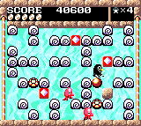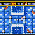 Enemies include walruses and octopi. There are bumpers around the playing field, which will bounce back any kicked ice block, potentially squashing Hiroyuki if you’re not careful. You can also fart and create a toxic gas cloud, which will temporarily stun enemies. In addition to the regular levels, where the goal is to kill all of the enemies, there are also Puzzle stages, where you need to kick blocks into a certain pattern, and Boss levels, where you need to kill a large enemy by tossing blocks at it. There are brief cutscenes every once in awhile, and the scenery changes every few levels.