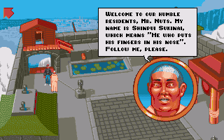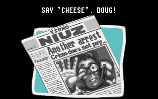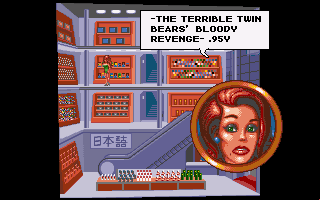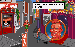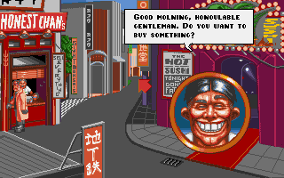 The artist gave them a comic book feeling, with word balloons, onomatopeias, odd perspective angles, and every time a new location appeared, it was in a black and white shot with captions reminiscent of a comic book page, that suddenly gained color, a very nice effect. After all, the game’s intro starts with a hand drawing the three leads on paper with a pencil and they suddenly becoming alive. The music however is nothing to write home about, and has absolutely nothing to do with Japan or Far East. An example is the rendition of the Peter Gunn Theme as Doug’s theme song.