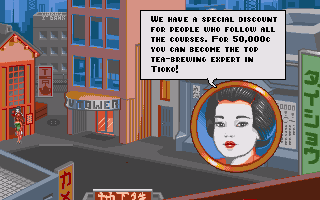 Reading the manual may give the impression that the game is somewhat of an examination of present-day Japan through Western perspective, but the “Mr. TZUTZUMI” credited in the intro as game designer reveals the true intent of the title. It really is a comedic game that plays with the most obvious cultural stereotypes such as karaoke, tea ceremonies, fast over-crowded trains, Yakuza, suicides and the idea that Japan’s industry would dominate the world economy. Every woman is dressed in a kimono and there are apparently sentient computers.
