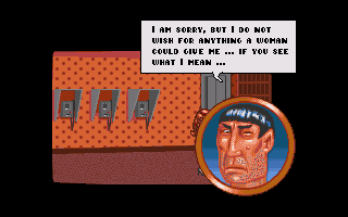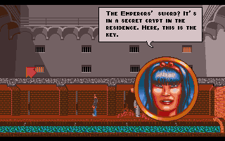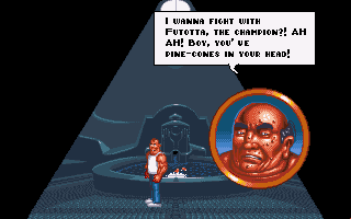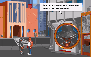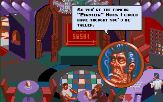 Still, the game is mostly remembered for its goofiness and zanyness rather than for historical accuracy. There are a lot of examples, from video game-related humor (two guys, who are actually the game’s creators, talk of making a game called “The Mystery of Ape Island”) to weird gags such as a Mr. Spock-look-a-like who is a gay concierge, and references that only could be understood by those familiar with the devs’ cultural background (for example, the Egyptian sarcophagi at the museum are actually caricatures of Italian politicians and TV celebrities). There’s also a fair share of ribald humor, especially in Donna’s mission, who has sex with a sumo – thankfully not shown on screen – to wear him down before a match and at one point uses a blow-up doll to withstand a fall. Also, the devs put themselves in the game as two creepy dudes hanging around the Hot Sushi strip bar… make of that what you will. There are even a couple of in-joke references to Crimetown Depths scattered here and there, such as the face of Jagoo (the player character’s employer) as an exhibit at the museum.