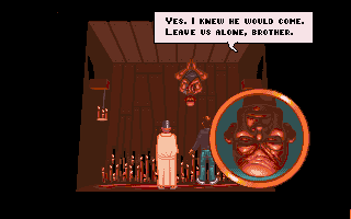 The interface is all mouse-driven – there is no status bar, and right-clicking anywhere on the screen brings up the symbols for the actions (open/look/take/talk, plus others depending on context) and the inventory. Dragging an object from the inventory over an object or person brings up the specific action it is needed in that case (i.e. rope and knife = cut the rope) without the need of cluttering the interface with too many icons. This drag-and-drop method is also used to combine elements you have in your inventory, but doing that is pretty awkward since to keep the inventory open you must keep the right button pressed.