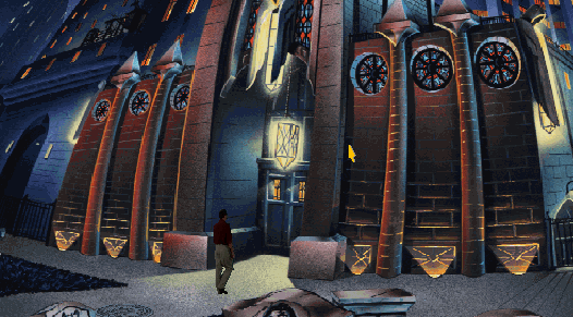 The interface is weird, too. Even though the game is displayed in the third person perspective, you can’t just move anywhere on the screen, and can only walk to certain predetermined points. Everything is controlled by the mouse, but you can’t cycle through verbs. Instead, you need to right-click every time and pick a verb from a menu. The cursor does not indicate hot spots, and nearly everything you need to pick up is either really tiny or shrouded in darkness. On the other hand, when you use an item from your inventory, the game will take over and solve any puzzles automatically, reducing the need to click everywhere on the screen. As a result, the puzzles are not particularly difficult, but the most frustrating ones are the kind where you missed a tiny bit of pixels in some scenario hours before. You can retrace your steps at any point, but it still feels tedious.